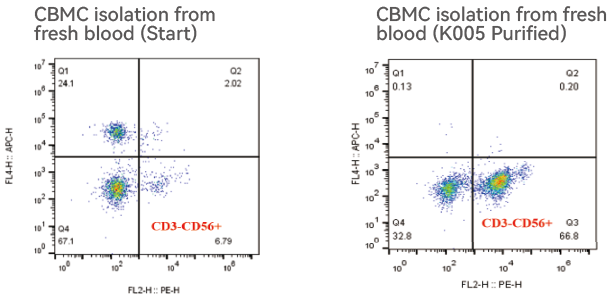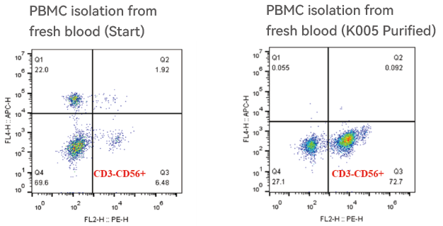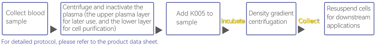 Based on the principle of density gradient centrifugation, simply add the K005 Human NK Cell Purification Cocktail to whole blood, incubate, and perform density gradient centrifugation. There is no need for expensive or complex magnetic or flow cytometry sorting equipment, saving time, effort, and budget.