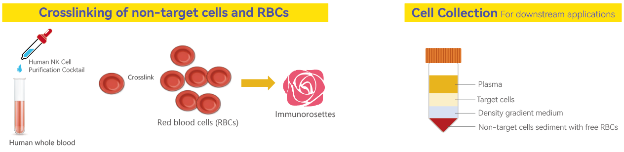 The Human NK Cell Purification Cocktail cross-links non-target cells in human whole blood with multiple red blood cells (RBCs) to form immunorosettes. These rosettes increase the density of non-target cells, enabling them to sediment—along with free RBCs—during centrifugation with a density gradient medium. Target cells remain unlabeled by antibodies and are highly enriched, allowing for easy collection at the interface between the plasma layer and the density gradient medium.